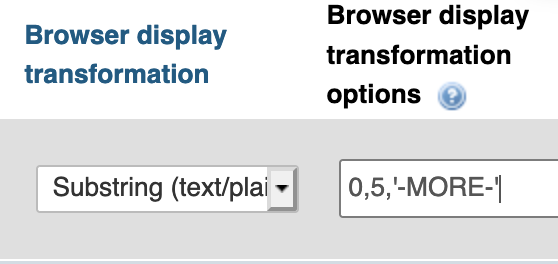 Sure! So the idea of this particular transformation is that it only displays a portion of the result, and can substitute some text when that truncation occurs. It's somewhat useful for forcing browse mode to only display part of a result, for instance if every row of a particular column starts with the same text "The president is:", one could use this transformation to only display the names with For my test, I have a table with one VARCHAR column and on that column (either with the Change link or when creating the structure initially) I've set a "Browser display transformation" of Substring and options |