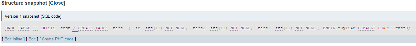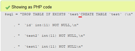 When you click on Create PHP code, from Tracking -> Structure snapshot, the PHP code created replaces the ; delimiter with nothing, between queries and creates malformed ones.