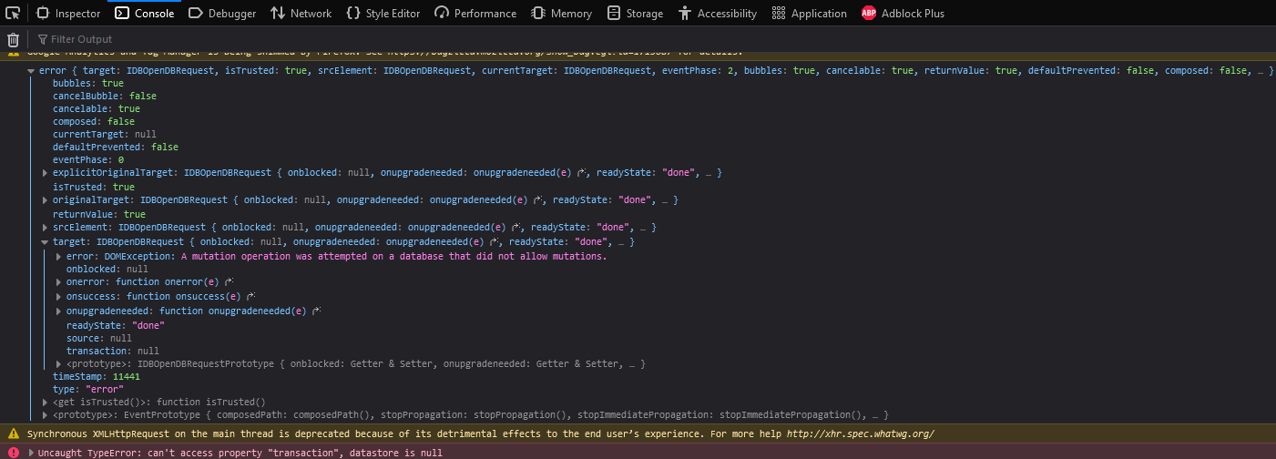 Can you please confirm whether the issue is happening in Private window only? I was finally able to reproduce it in a private window. Related issues: https://bugzilla.mozilla.org/show_bug.cgi?id=781982 , https://stackoverflow.com/questions/31159316/detecting-preventing-firefox-indexeddb-invalidstateerror-caused-by-private-brows |