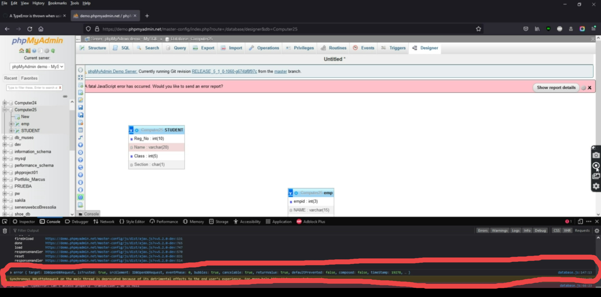 I think the issue won't occur now. The code has been changed and the stack trace is old. The new change fixes the issue and should be closed. The issue was not reproducible on Windows as well. phpmyadmin/js/src/designer/database.js Line 113 in fa1a6c9