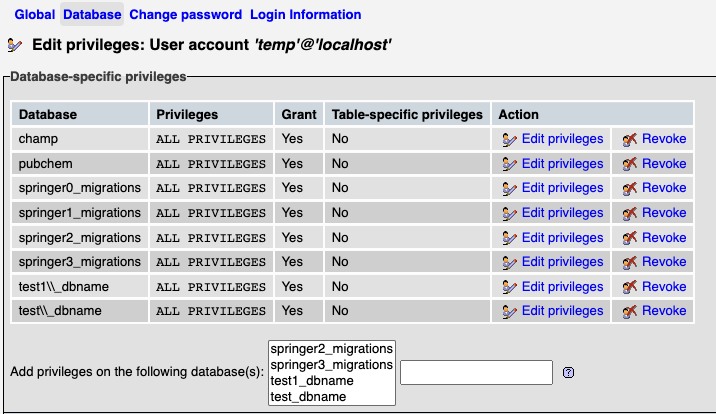 When a database name has a '' preceded by a digit in its name and a user is assigned to the database via the multiselect list on the 'database' tab of the 'Edit privileges' page, the name of the database is corrupted because of the '\' needed to escape the database name in the multiselect list. If additional databases with '', but no digit preceding, are selected they are also affected, whereas if only a database with a '_' and no digit preceding is selected it is not affected.