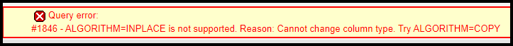 #1846 - ALGORITHM=INPLACE is not supported. Reason: Cannot change column type. Try ALGORITHM=COPY