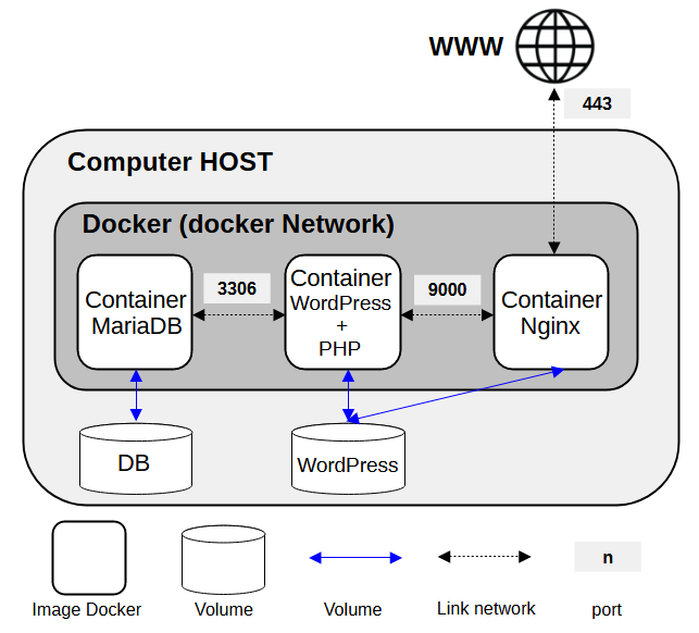 - Create 3 containers. One with MariaDB, one with WordPress and the other with Nginx. None of these images MUST BE a pre-built images! All images MUST BE created from the Debian or Alpine (in this case, I chosse the Alpine).