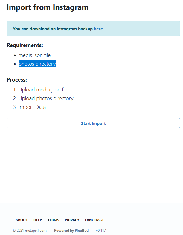 Instagram import cannot be completed, because .zip files provided by instagram in both JSON and HTML formats do not contain required media.json file neither "Photos directory".