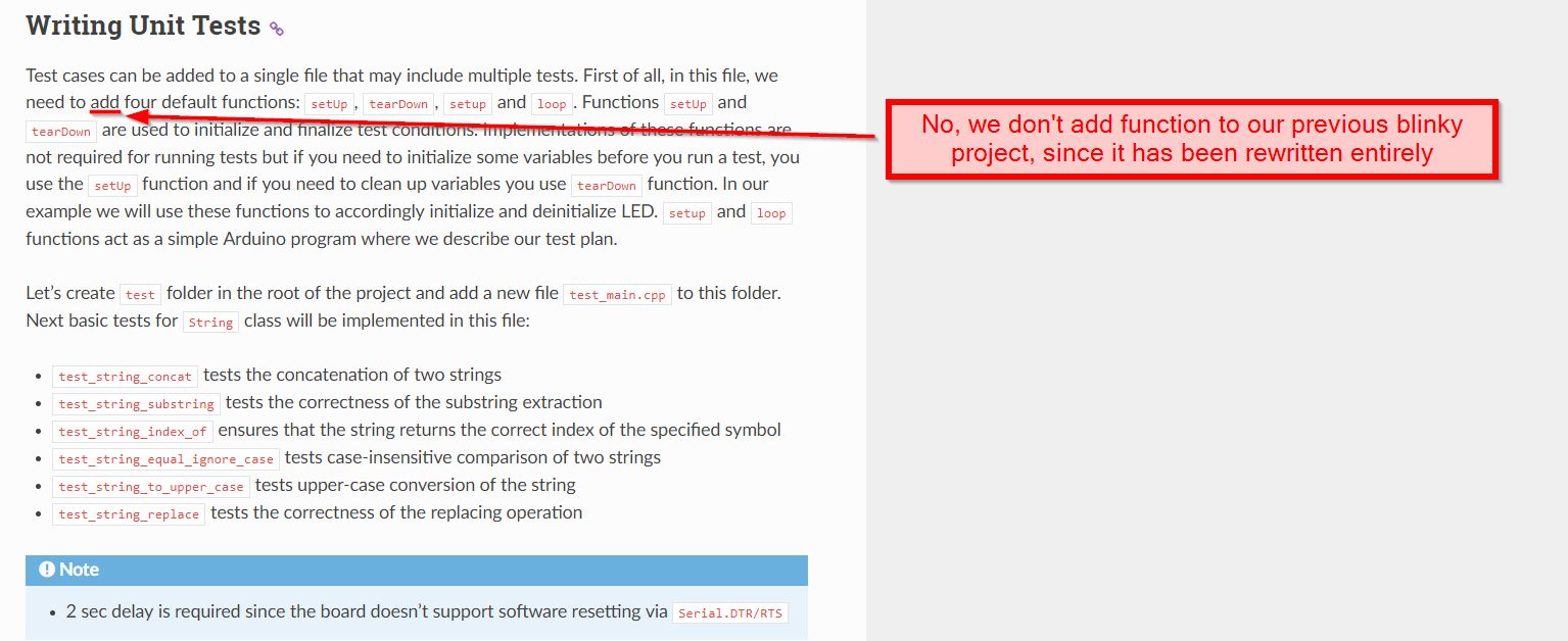 So to correct this problem, in the section writting unit test you can create previous paragraph (between writing unit test and "Test cases can be") accompanied by a source code that manages hello_world strings, And then you can explain "but as we cannot easily verify the content we need unit testing." And only after this you can say in the next paragraph: "we need to ADD four functions etc..." to test our code.