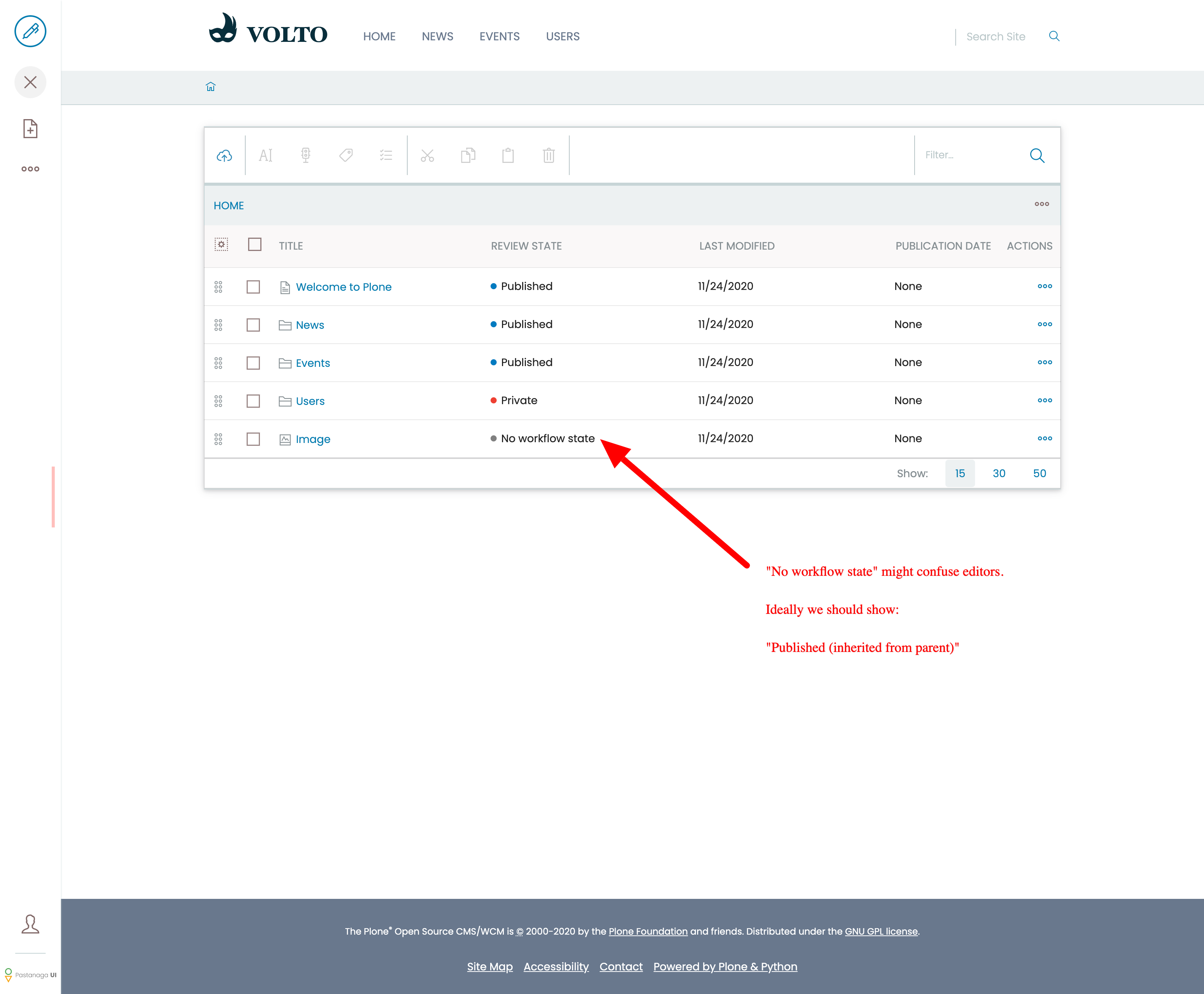 Editors are confused by the "no workflow set" message in the folder_contents view and don't know what to do with it.