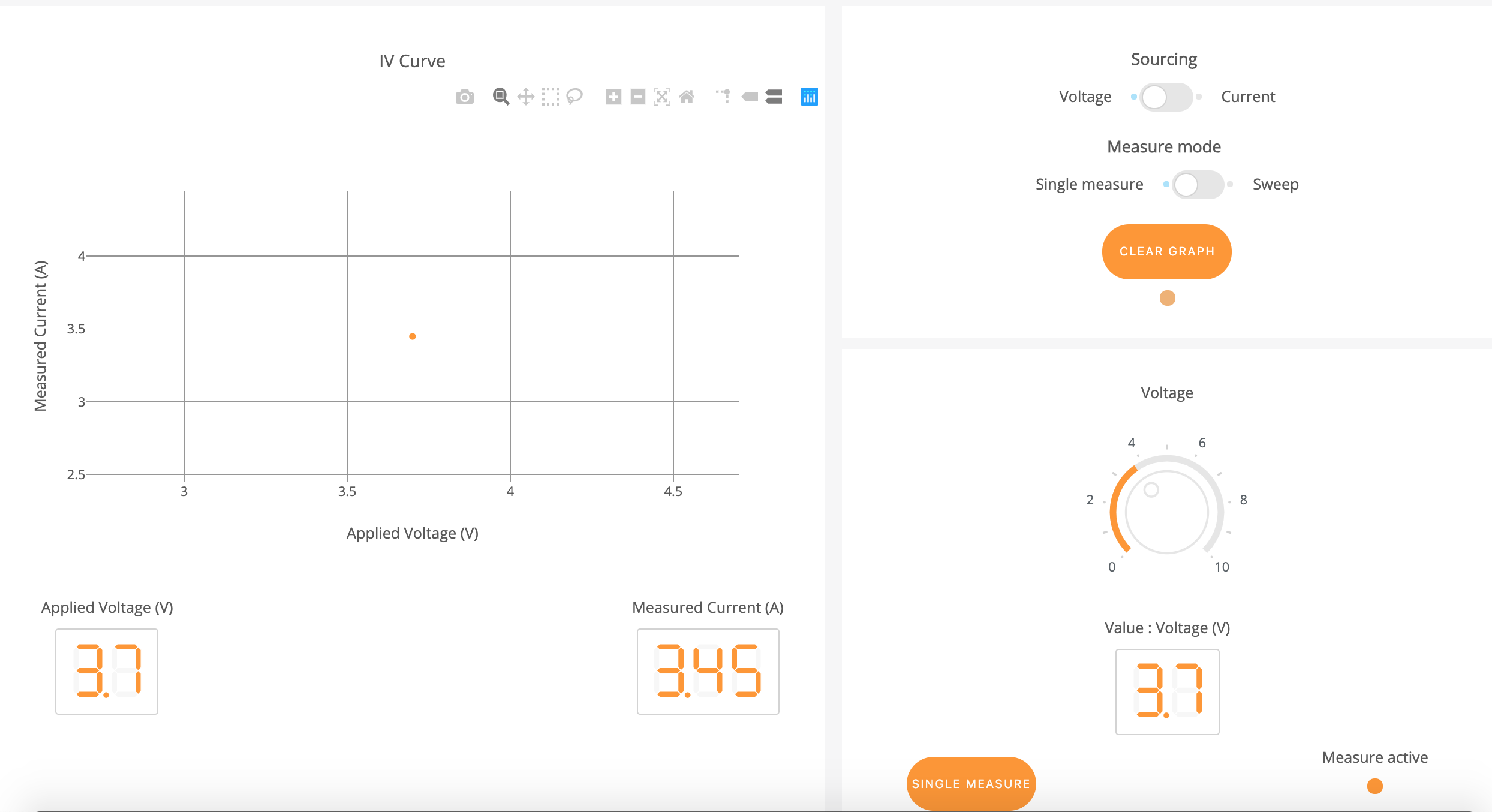 When the voltage/current value set from the daqKnob and Single Measure is clicked, we expect having a single data point on the graph like in the python version. However, when there's only 1 data point in xdata and ydata, the callback was returning an empty graph. Just duplicating values in this scenario solved the issue. However, not sure if it is the best solution.