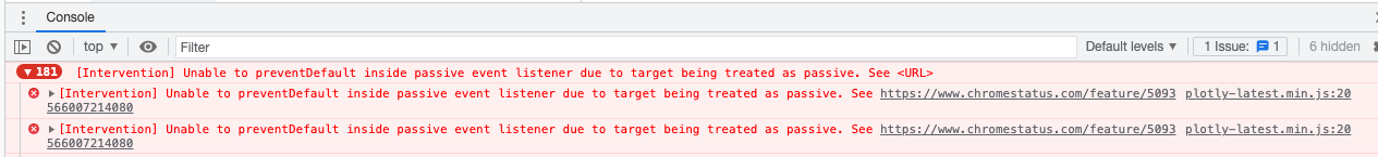 I am posting this in the JS section for Plotly because I get this error in the Chrome Console while scrolling through the Dropdown for the second plot, but not the first: