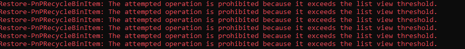 When we run the command: Get-PnPRecycleBinItem -RowLimit 200000 | ? {($.DeletedDate -gt $date2 -and $.DeletedDate -lt $date1)} | Restore-PnPRecycleBinItem -Force -RowLimit 200000