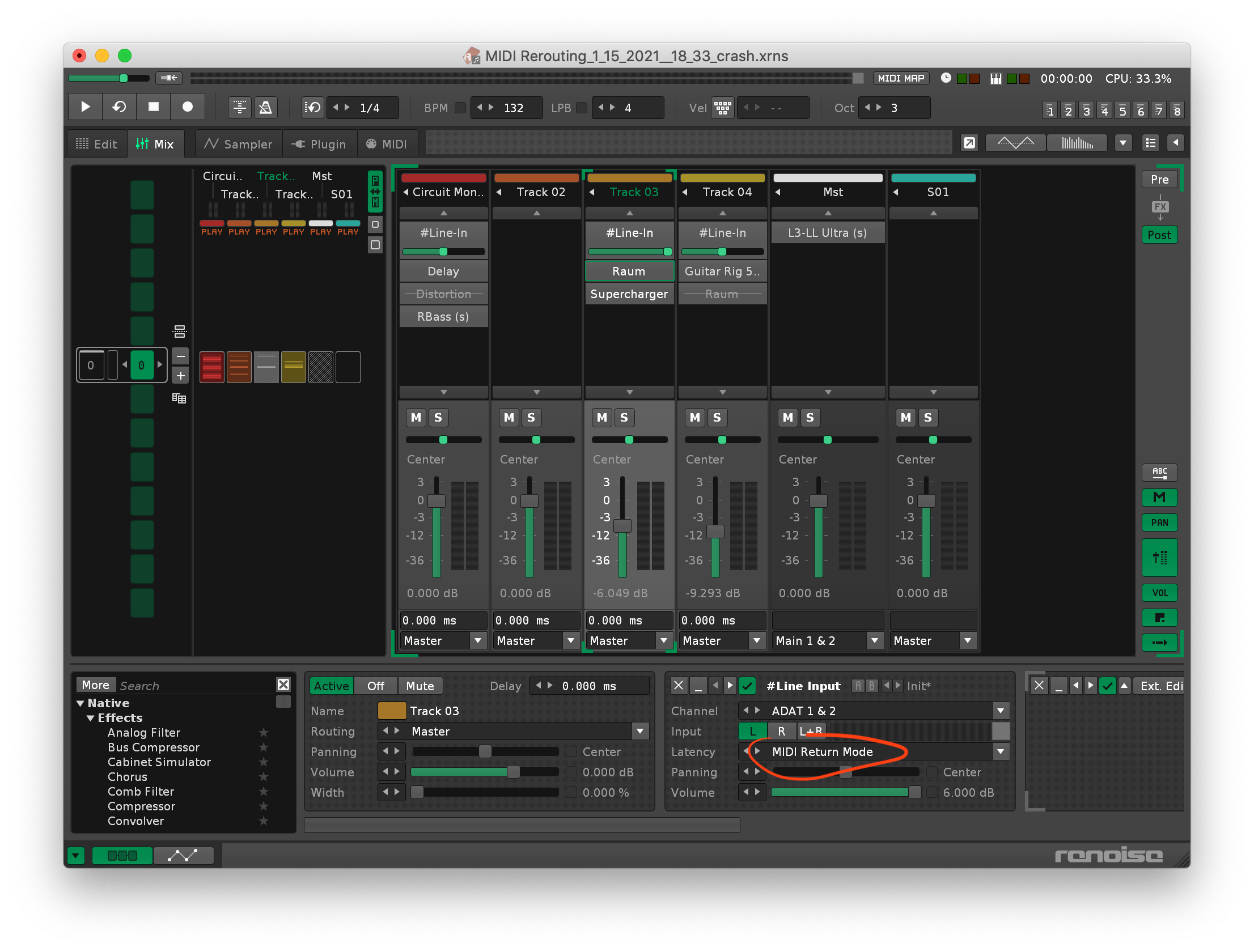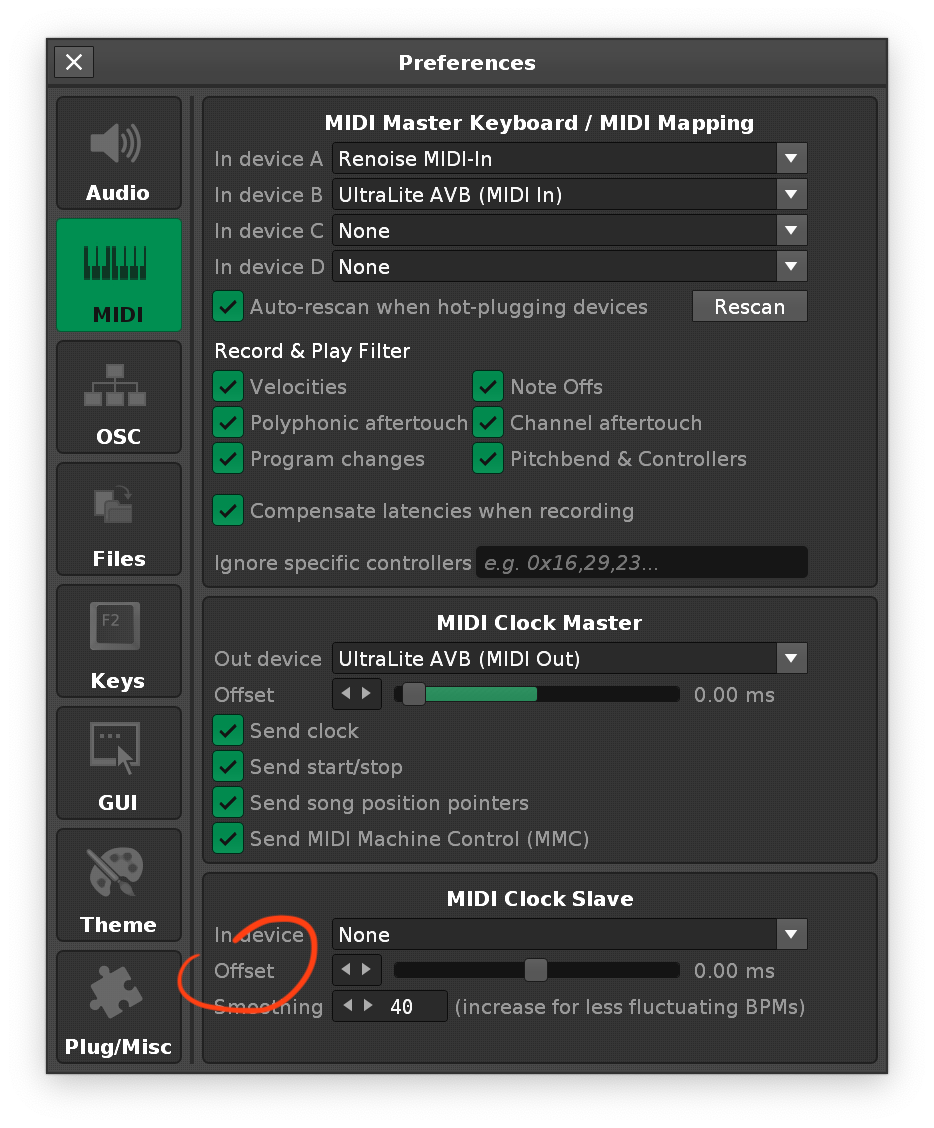@ambv Yes, but the Midi clock sync delay ultimately has no effect on this problem since the delay is applied equally to both the internal instrument and the midi instrument. Adjusting the delay shifts both events forward/backward in time but the internal sample is always recorded ~15-20ms late, relative to the midi instrument. My external clock tempo is 120bpm. Also, I'm seeing the exact same difference in latency between internal vs midi instruments when using Tracker as the master clock as well. It seems to me the Tracker's audio output is being emitted about ~20ms later than the Tracker's MIDI output for any given step (@ 120bpm). Are you not able to reproduce the issue? |