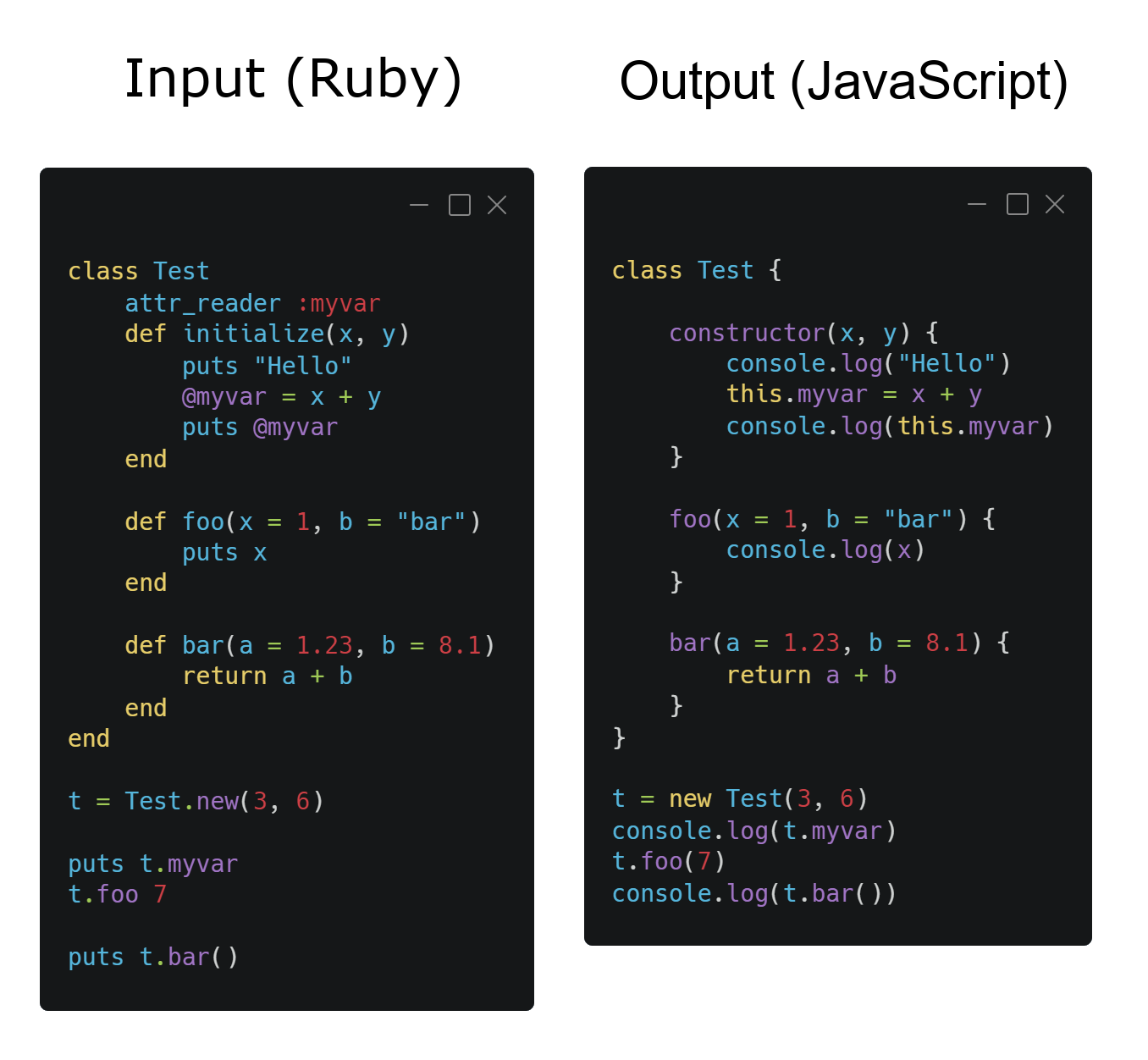 Translator written in Python, which allows you to convert your Ruby code into JavaScript code. A sample conversion: