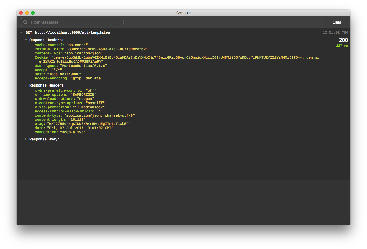 - Console logs (http://blog.getpostman.com/2014/01/27/enabling-chrome-developer-tools-inside-postman/ for the Chrome App, View->Toggle Dev Tools for the Mac app):