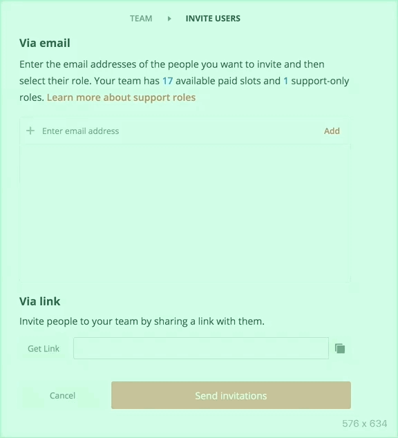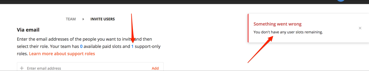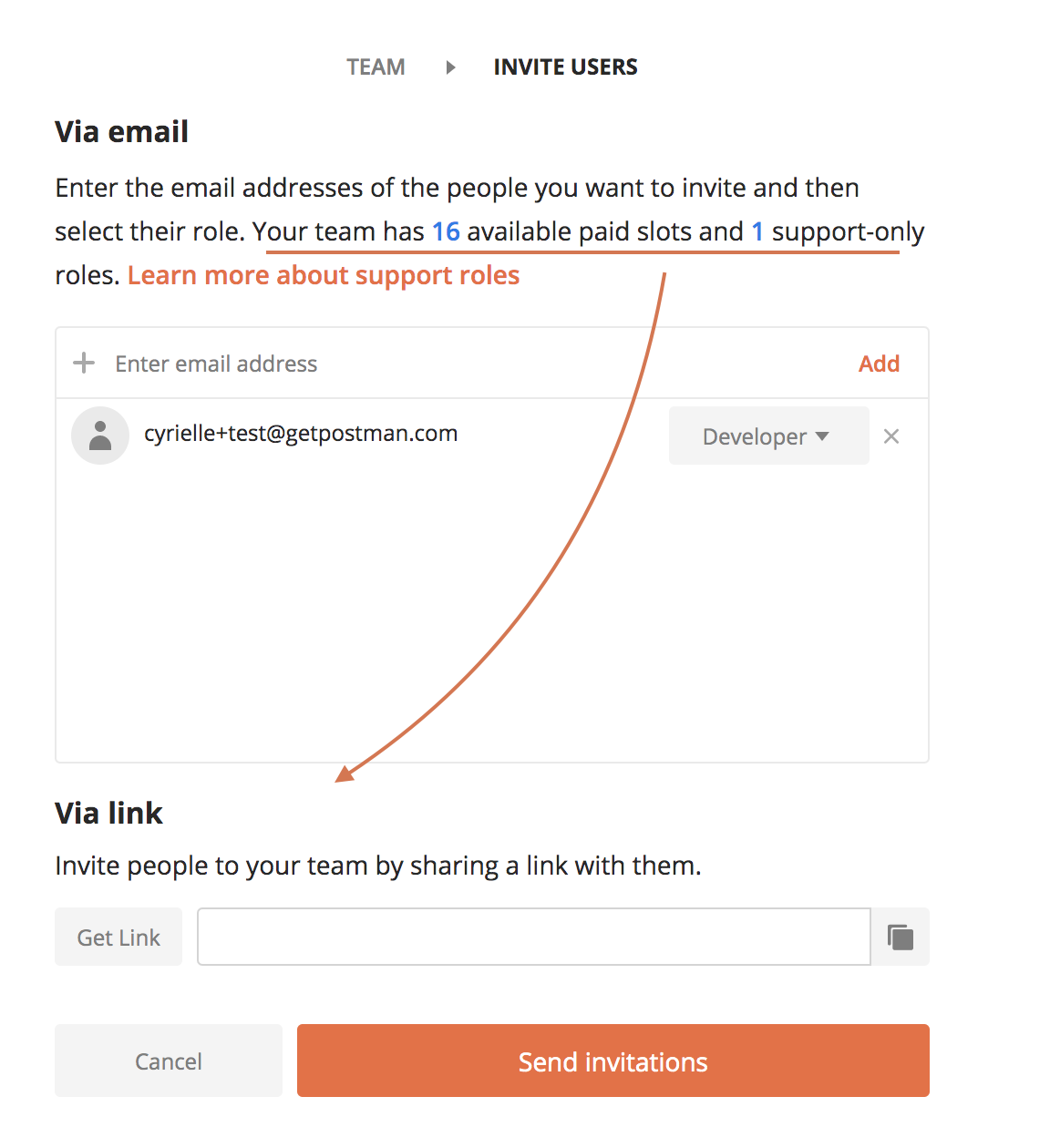 The flow to add support-only accounts on https://go.postman.co/team/invite may be confusing as the action of adding Via Email automatically attributes the Developer role and you cannot untick the box for Developer while there is no slot available for the team.