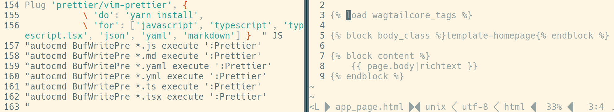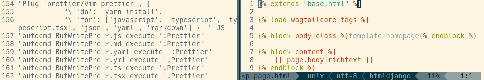 - As you can see in the screenshot, html/htmldjango filetypes aren't evne listed in the vim-prettier Plug for list. Therefore I cannot run