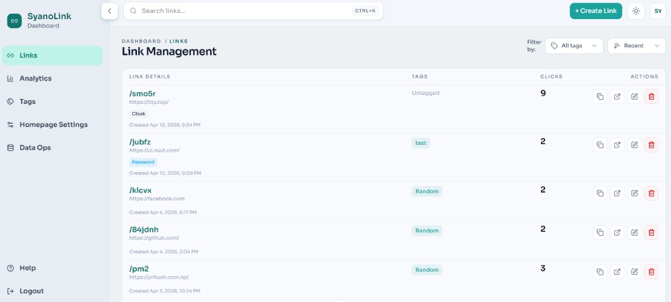 Syano is a free, open-source URL shortener that gives you complete control over your links and data. Unlike Bitly, your data stays on your server with no tracking or limitations.