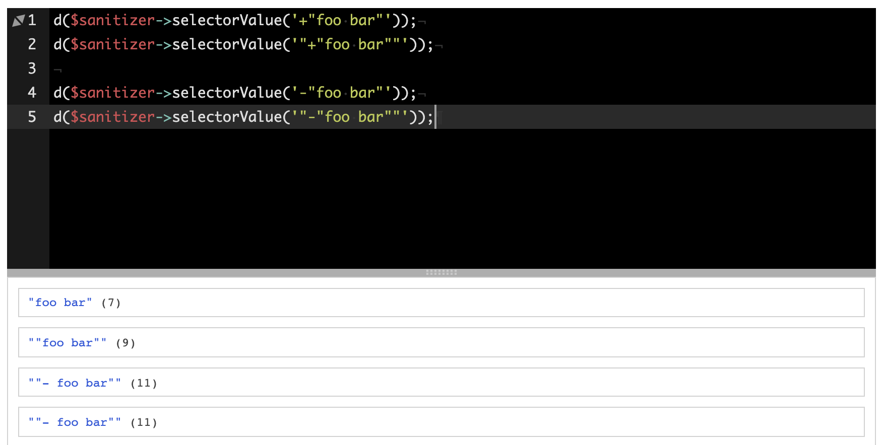I'm having trouble figuring out a way to sanitize user-provided query string that is used in context of the advanced text search operator. The general guideline is that $sanitizer->selectorValue() should be used (and it does, or there's a risk that the query may contain something potentially harmful, or at least "surprising"), yet I haven't found a clean way to make a query such as +"foo bar"