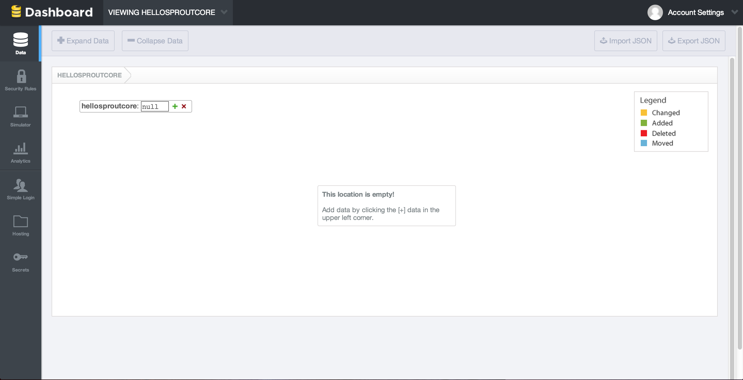 Click on your new app, and you will see a fairly blank screen with a section showing all of the data in your application. Currently, that would just be the empty, root node.