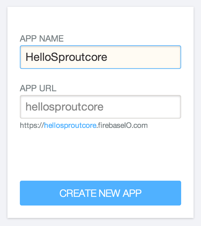 First sign up for a Firebase account, then create your app by entering a name in the App Name field.