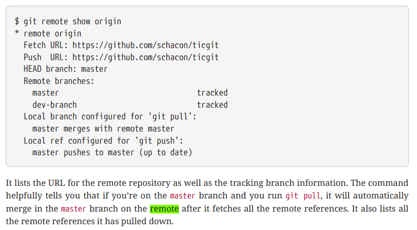 if you’re on the master branch and you run git pull, it will automatically merge in the master branch on the remote after it fetches all the remote references. It also lists all the remote references it has pulled down.