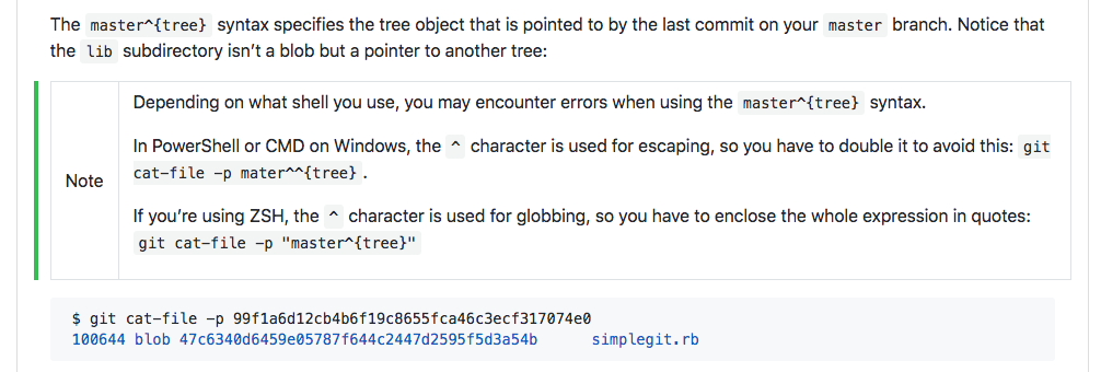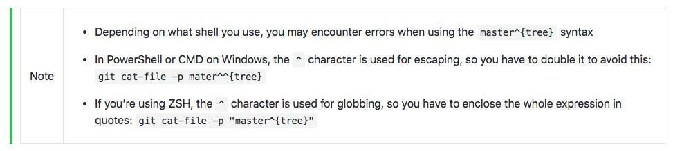 * In PowerShell or CMD on Windows, the `^` character is used for escaping, so you have to double it to avoid this: `git cat-file -p mater^^{tree}` | ||