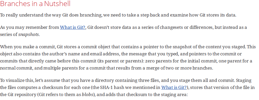 As you may remember from <<ch01-getting-started#section__what_is_git>>, Git doesn't store data as a series of changesets or differences, but instead as a series of _snapshots_. |