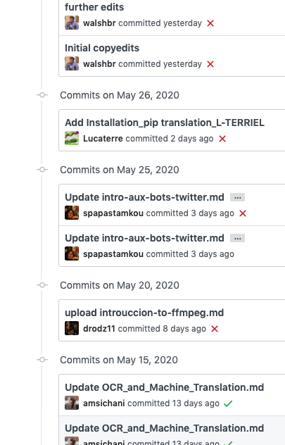 There was an issue introduced several commits back that broke the site build, so it stopped rendering properly. The issue with this is that, until the build error is fixed, the build will continue to error until someone fixes it. And it won’t build on the subsequent pushes. That means, for example, that if I had had looked at the live, rendered version of my lesson in progress that I just committed to I might be wondering why changes I pushed weren’t showing up. The errors persist until someone notices them and fixes them, and there’s not really anyone tending to them. Most of the errors eventually get ironed out in the review process, but that can often take a while. They’re primarily errors introduced by authors who have made mistakes with the metadata or include syntax for figures. The build error here actually wasn’t resolved until made changes to four different lessons in progress. No one is really tending the repo in that way, and there's not a good process for making sure that those sorts of errors don't take place.
