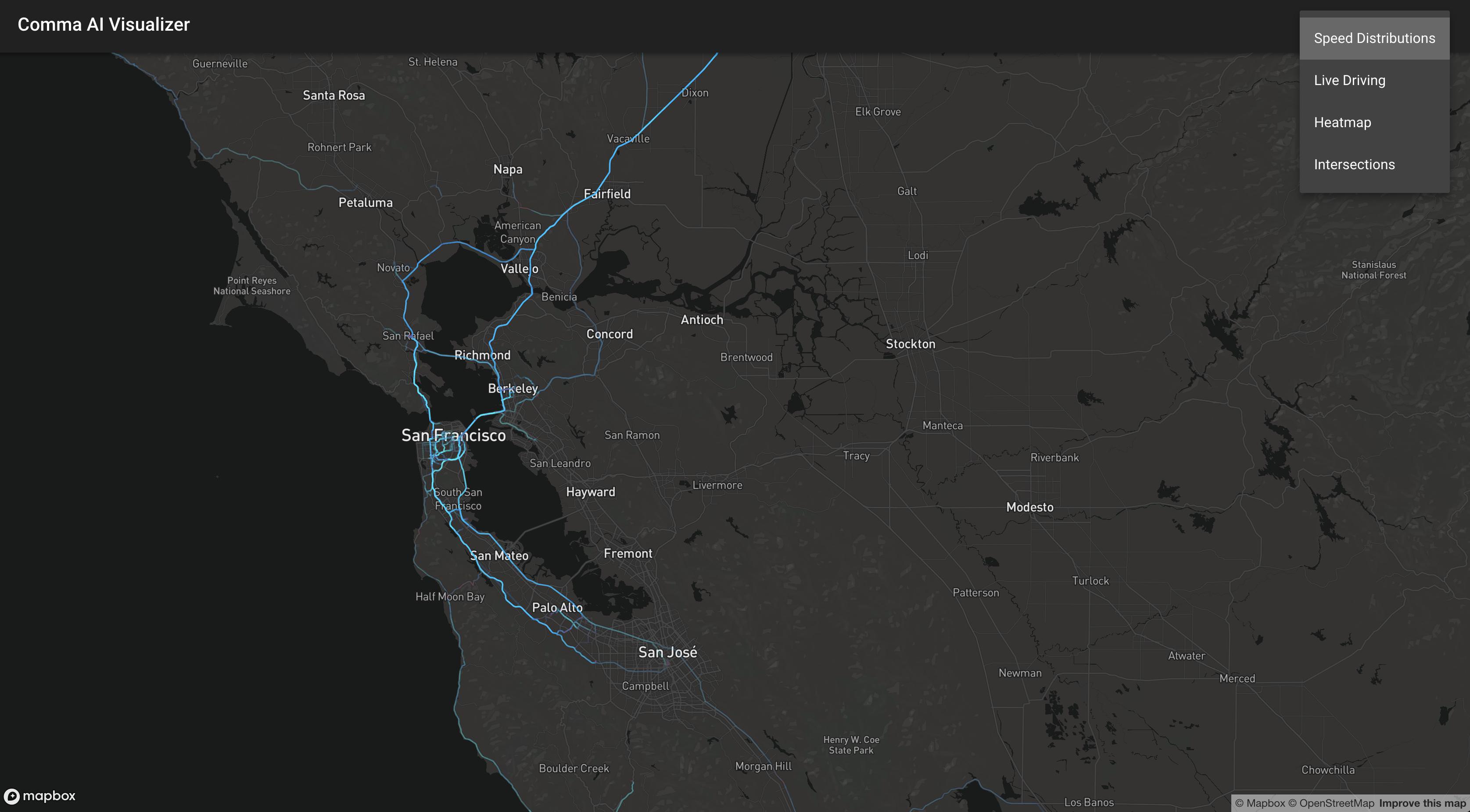 A simple react app that will display 1,000 trips from the SF Bay Area, each of which is a JSON file containing an array of coordinates and speed sampled at once per second. Ultimately creating a interactive map visualizing the distribution of speeds along trips recorded with our dash cam app Chffr.