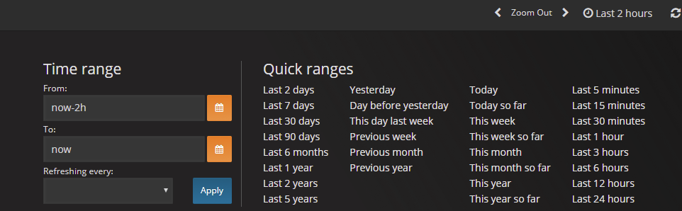 Cool, thank you! We should keep the option to specify a relative time range, as that's easier when you want to take a quick look. I find Grafana a bit too much and I don't find the order of the quick ranges intuitive. Hiding some of the options in a drop down like grafana does it could be helpful. I guess we should separate the "stacked" button from the time options, at least with a vertical break line or some space. I don't have a good suggestion on the design besides that. Regarding my older comment, I think I misunderstood the request back then to add a time option to the console view as well. Would be great though. |