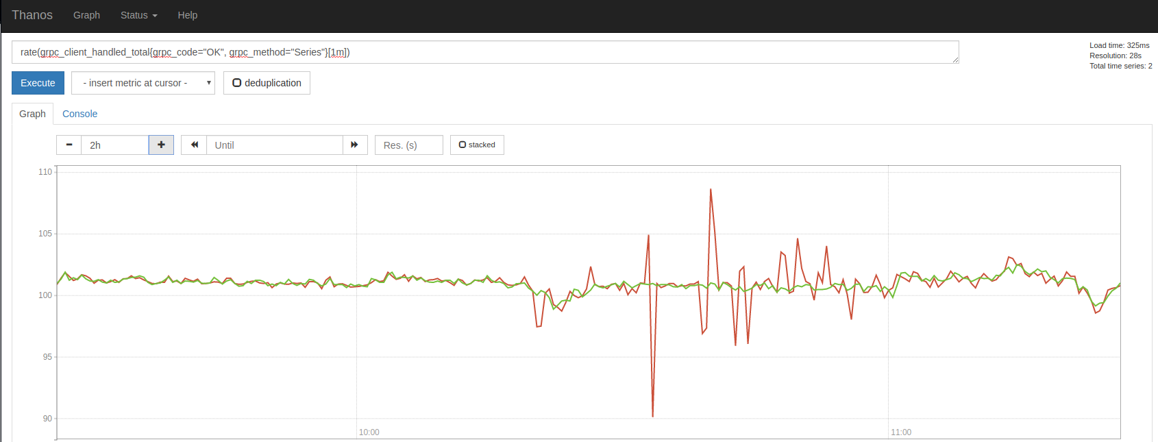 Hello, I spent some time today to verify it and I can still reproduce this. I was testing against Prometheus 2.0 built from Every time I send SIGHUP signal we seem to drop some samples (scraping restarted?). Thanks of our new Thanos project I was able to spawn Prometheus in 2-replica HA and reloaded config on just first one. Below screen shows a rate over some counter that has artifacts, but only for one replica that was signaled. Thanks to the Thanos' global querier, we can see it on same the graph: Red line: Prometheus replica 1, after some ~9 SIGHUP-s Below some graphs from the Prometheus UI on replica 1 (one that was signaled a lot) and its Beside the Prometheus version this setup is similar to what we are using heavily with Prometheus 1.8 and we did not see that issue. So #2830 will certainly help for some use cases, but when you certainly have config changes, we will still hit that. (: |