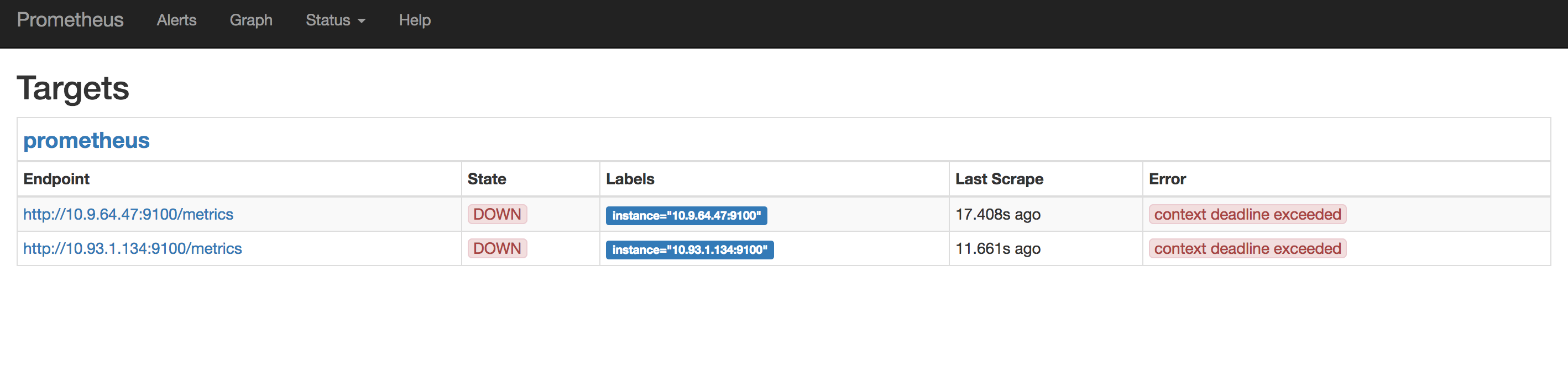 Does the endpoint http://10.9.64.47:9100/metrics work from other servers, or even from that server itself (i.e. on 10.9.64.47 try running As for Issue No. 2, if prometheus isn't able to get a response from your target(s) in the configured timeout, it will assume they are DOWN. Effectively your issues are linked; targets hang when asked for metrics and prometheus, rightfully, believes they aren't working. |