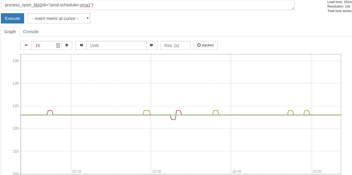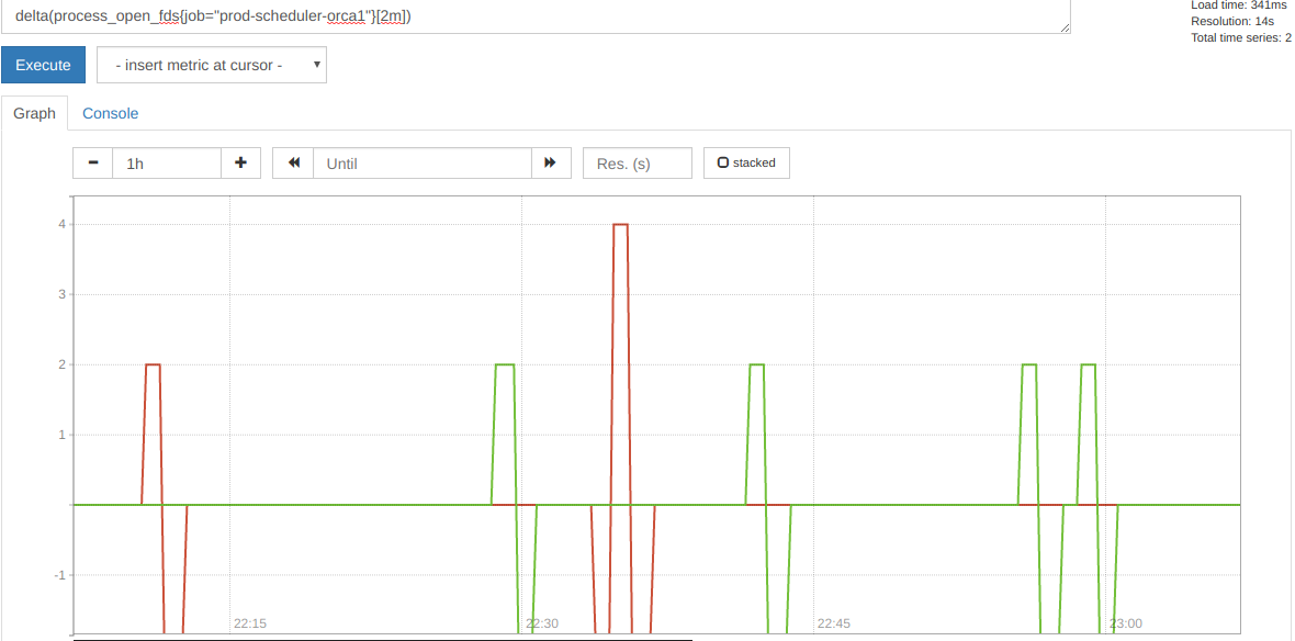 If you look at the test diff I sent, the difference from the test directly above it is that I'm asking for a delta on a range that doesn't land exactly upon a sample time. Almost all the other tests run exactly on a sample point, which doesn't exercise the extrapolation code. In real world usage, I've never seen promql returning results synchronized with samples. Also, as the bug name states, rate and irate similarly report incorrect results. Here's what this looks like from a user's point of view. We have a gauge holding the number of open file descriptors. It isn't easy to see in this snapshot, but the value is almost always 123, sometimes down to 122, sometimes up to 124. Now take a delta: The delta always shows increments and decrements by factors of 2. That never occurs in this graph. irate also shows increments as a factor of 2. These graphs are taken from prometheus 1.6.1's graph interface. The video you linked is 40minutes long. If you'd like to reference a particular part, I'm happy to take a look. However the results we're seeing are creating misleading graphs, and clearly impossible graphs are how I discovered the issue. In the short term, we've started using correction factors to correct the graphs, eg divide by 2 when using 2m aggregation, divide by 1.25 when using 5m aggregation, etc. |