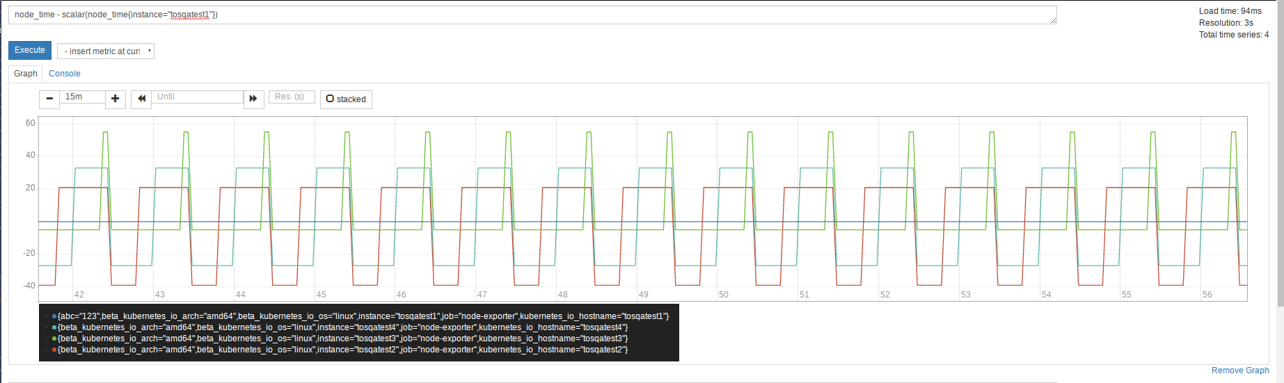the metric node_exporter:node_time_diff value never changed,but the expression node_time - scalar(node_time{instance="tosqatest1"}) value normally changed by per job scrape interval (1 minute).