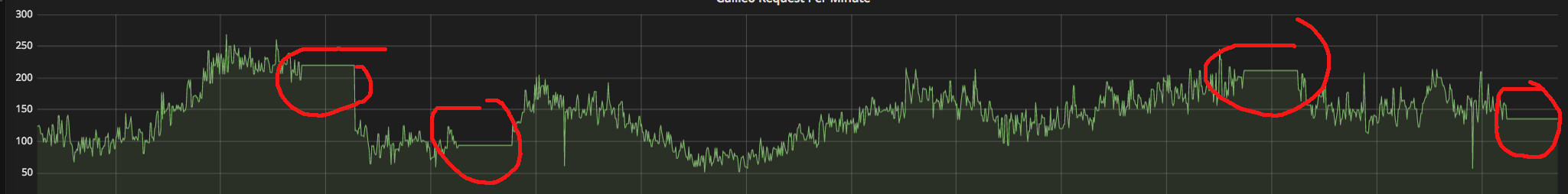 You can configure how to handle "null" values in grafana. For me it looks like your application is not providing this metric for some time or returning the same value during this period (metric updating issue app-side or no requests at all). And grafana is simply connecting the datapoints according your "null value handling" configuration. How does this graph looks like if you zoom into this "flat" time range? |