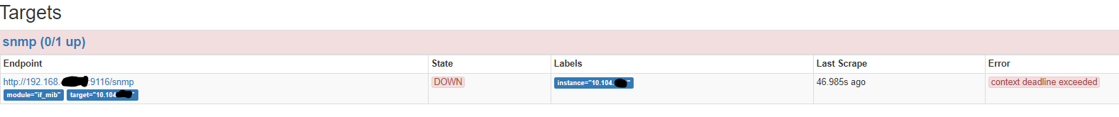 It makes more sense to ask questions like this on the prometheus-users mailing list rather than in a GitHub issue. On the mailing list, more people are available to potentially respond to your question, and the whole community can benefit from the answers provided. SNMP is slow, increase the timeout. |
