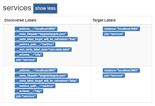 When everything is up, check targets or service discovery view (since 2.1.0) to see that there are two endpoints each having exactly one Copy over the following content into the targets.json where both endpoints have one additional label. The 9091 added one [