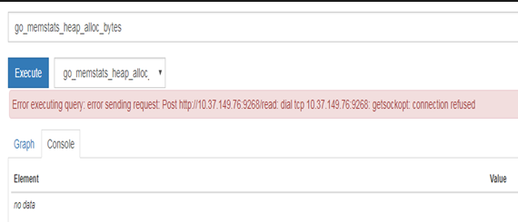 [Results between killing and recovering] log is as following ("http://10.37.149.76:9268" is the cratedb adapter endpoint): level=warn ts=2018-02-06T07:54:43.342766278Z caller=queue_manager.go:485 component=remote msg="Error sending samples to remote storage" count=100 err="Post http://10.37.149.76:9268/write: dial tcp 10.37.149.76:9268: getsockopt: connection refused" My question: 2)Grafana 3)CrateDB [Results after recovering] 2)Grafana 3)CrateDB