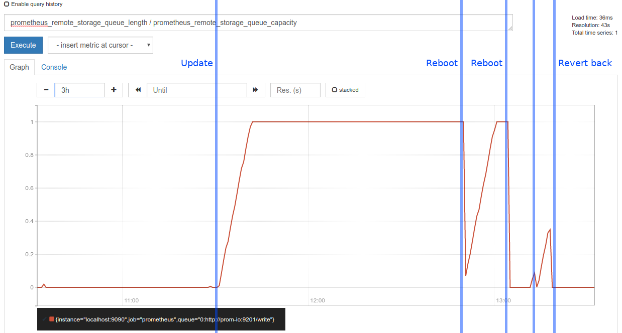 Writes to the remote storage are not flushed. The remote_storage_queue fills up until no more elements fit in and then samples are dropped.