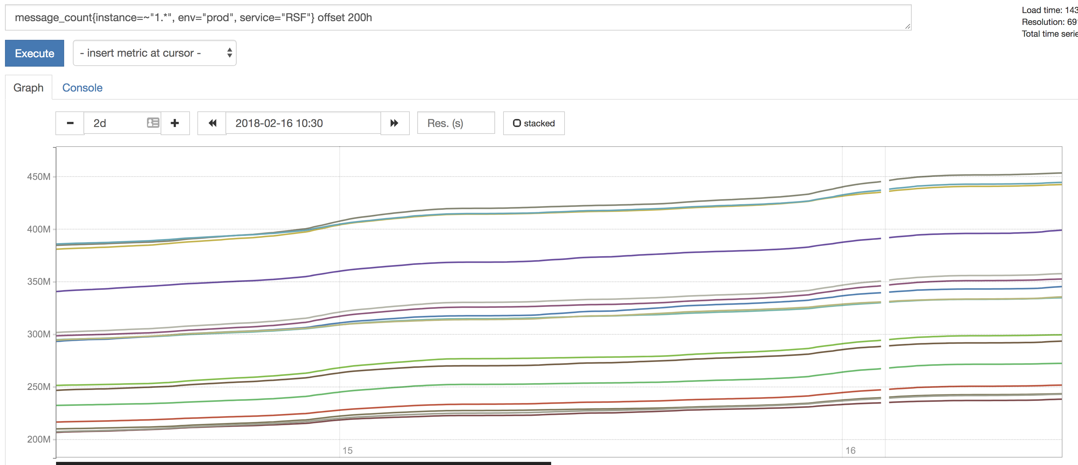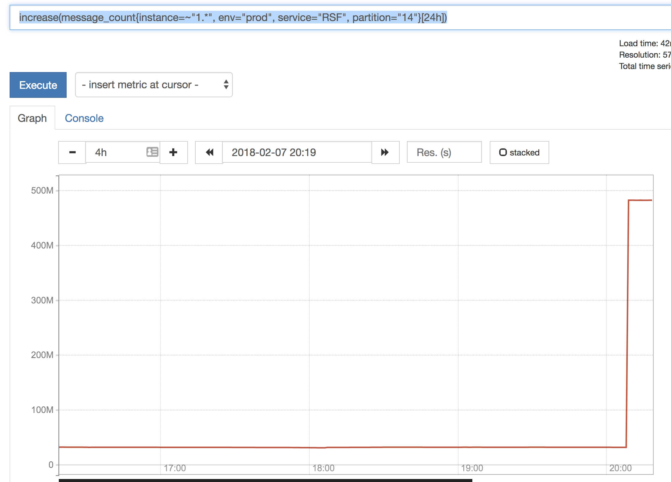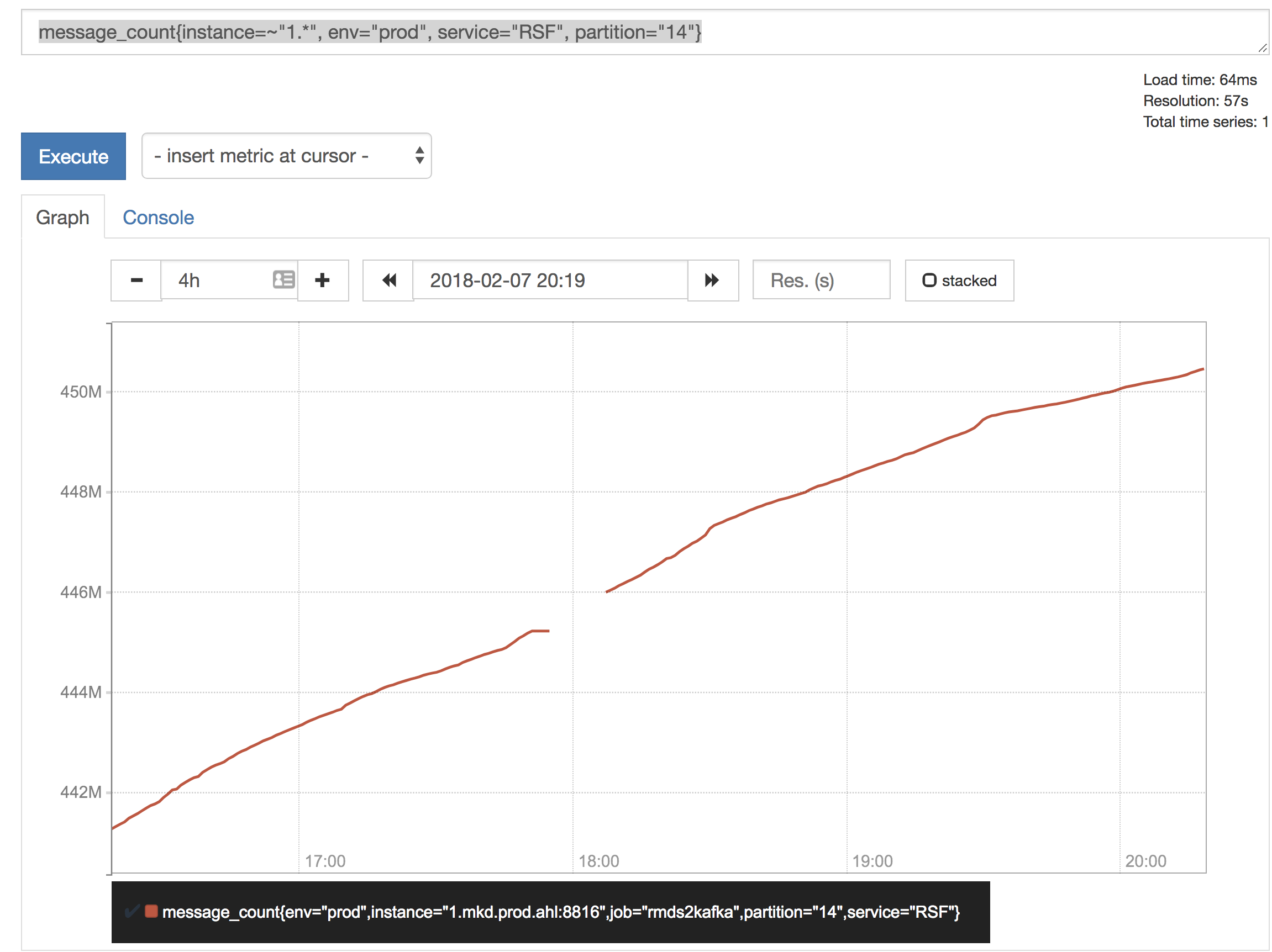 http://prometheus.dev.ahl:9090/api/v1/query_range?query=message_count%7Binstance%3D~%221.*%22%2C%20env%3D%22prod%22%2C%20service%3D%22RSF%22%2C%20partition%3D%2214%22%7D&start=1518020340&end=1518034740&step=57&_=1518780931424 Increase