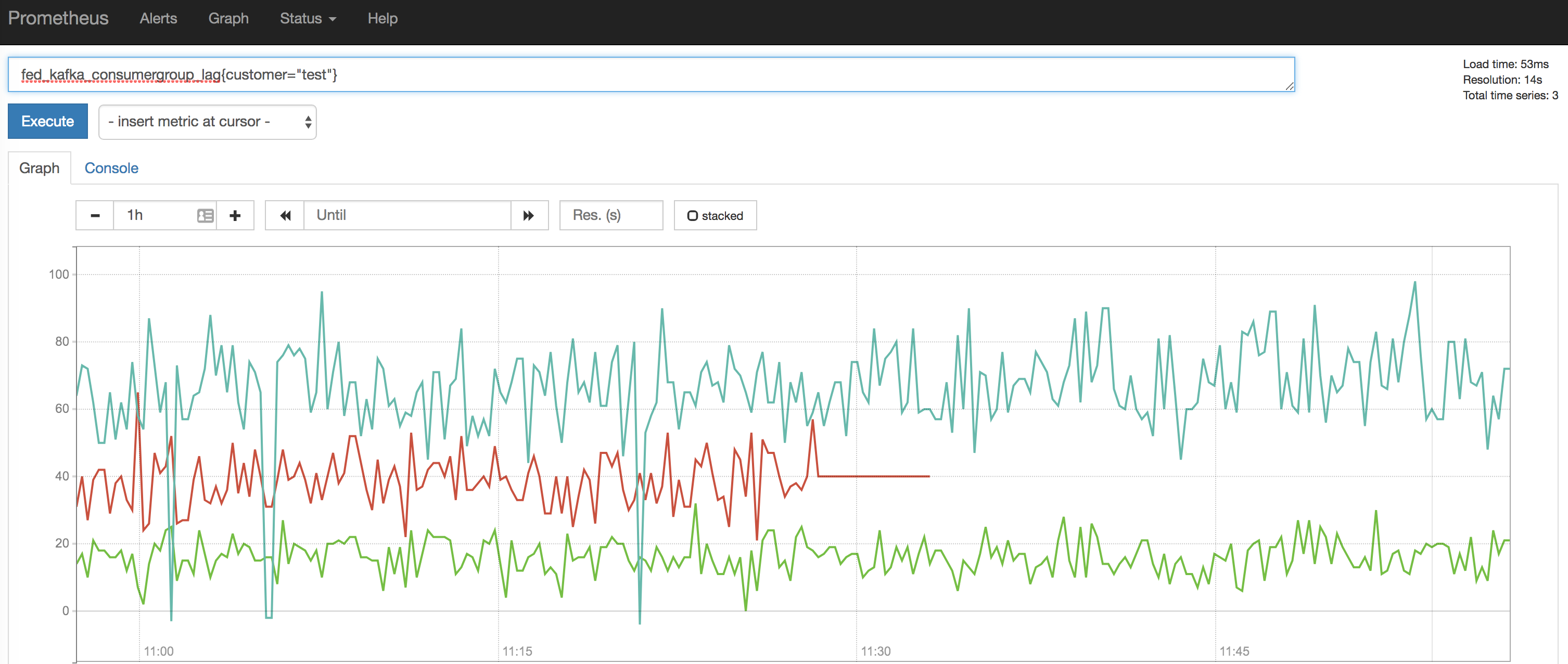 There are 3 metrics/lines. They were scraped from a prometheus server (1st level prometheus server) which is in charge of collecting all the metrics for customer "test". Each metric was reported by a separated agent and is constantly monitored in order to trigger an alert in case a metric drops (in other words, in case of service failure).