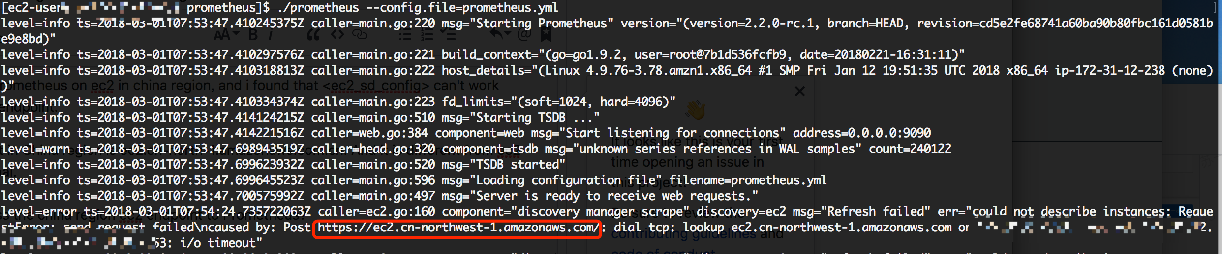 Hi,I am using Prometheus on ec2 in china region, and I found that <ec2_sd_config> can't work because of aws endpoint.