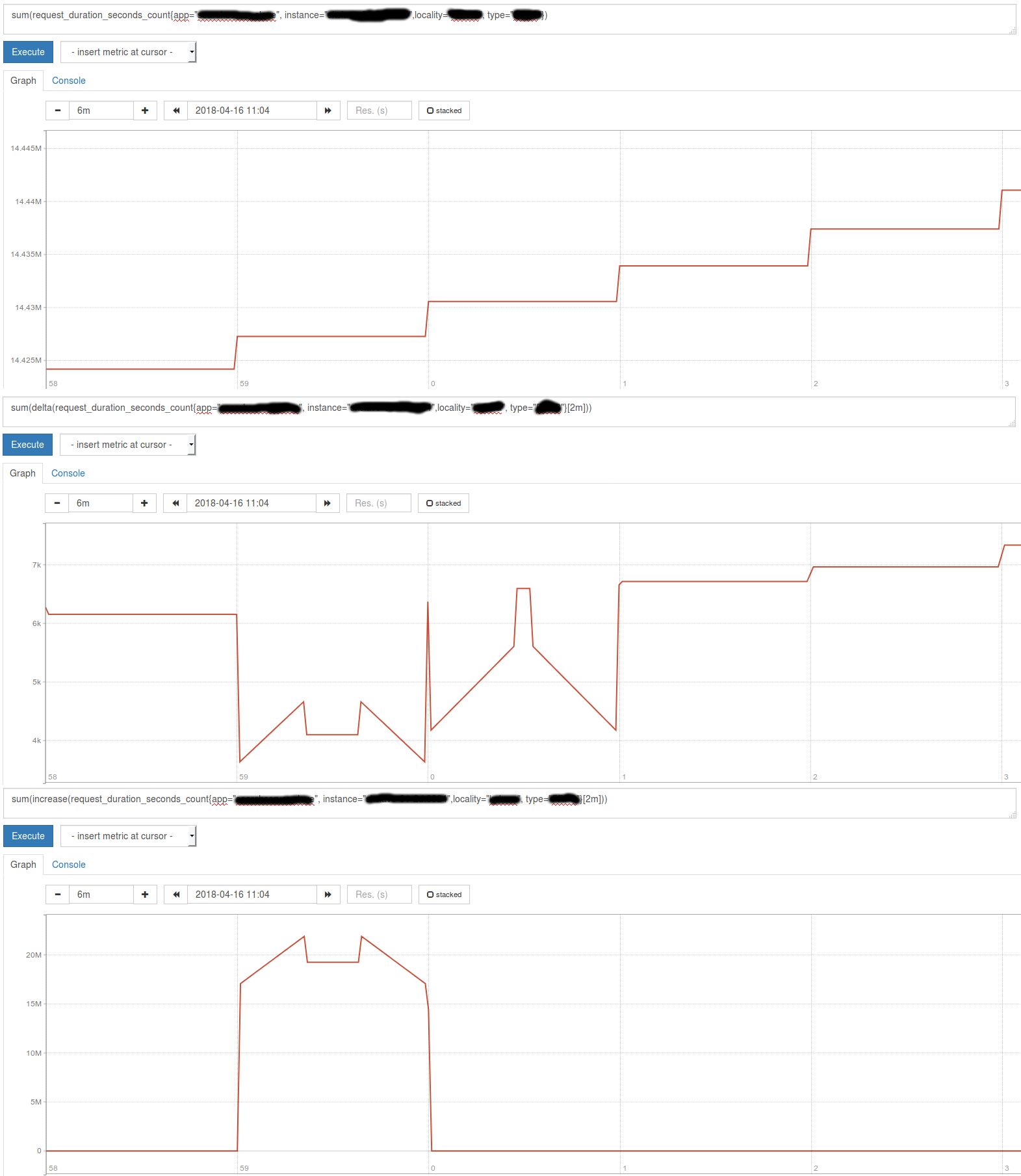 Ok thank's for the quick reply I know that I'm supposed to use increase not delta I'm using the increase/rate the delta was used just for debugging. If you look at the first and third figures in first image those are raw counter and increase. The increase was about 3000(img1 figure1) and result of increase function is 20M(img1 figure3)? I used the delta just to illustrate what caused the raise in the increase. |