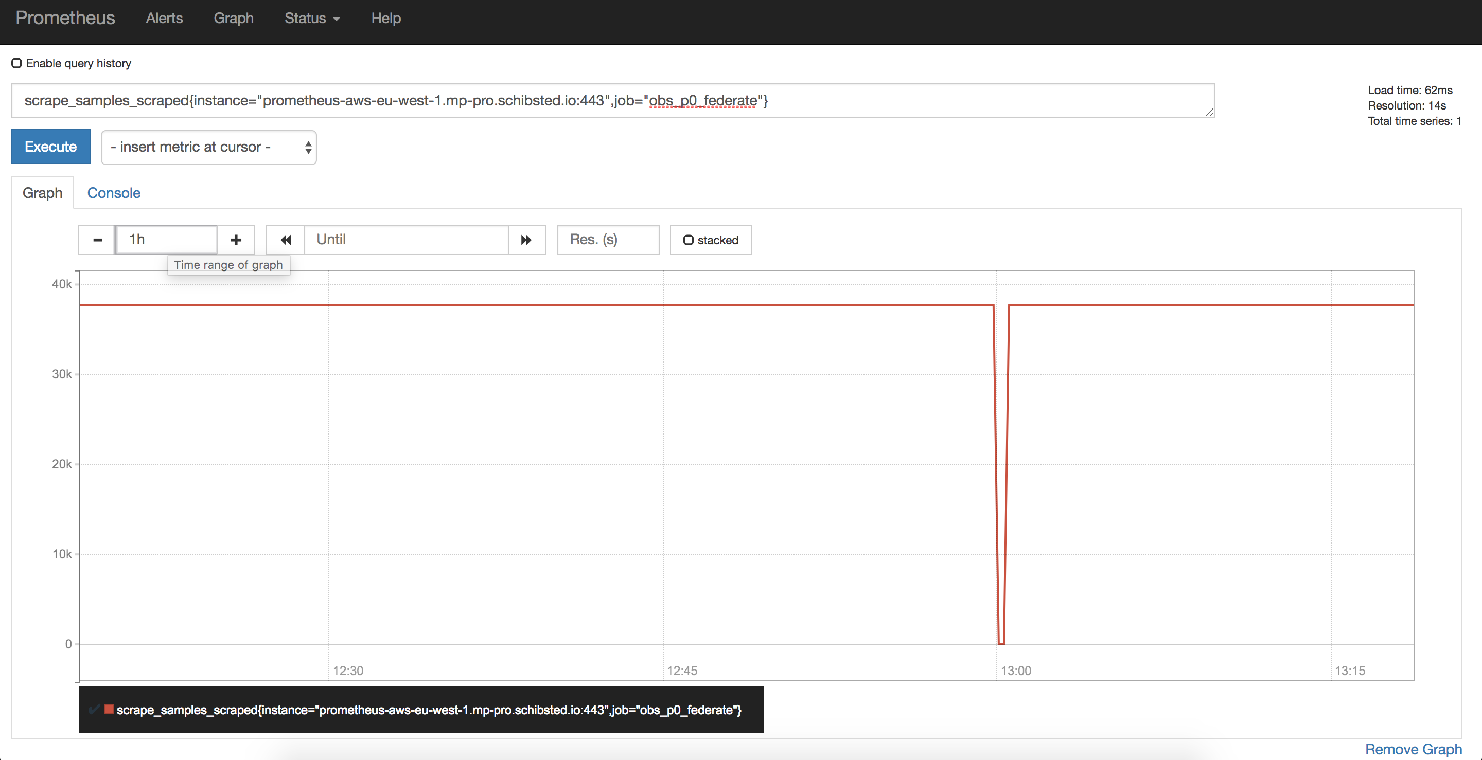 I am still a bit curious why this happens. prometheus/vendor/github.com/prometheus/tsdb/head.go Lines 481 to 483 in 5b27996 I just tried the federation and it returns the mos recent ingested sample+timestamp so even if you scrape the main Prometheus server every 2h (like in your original config) you should still be getting a recent timestamp which should be within the current The only explanation would be if the main server that you are federating returns a timestamp that is too old so it cannot be ingested in the current |