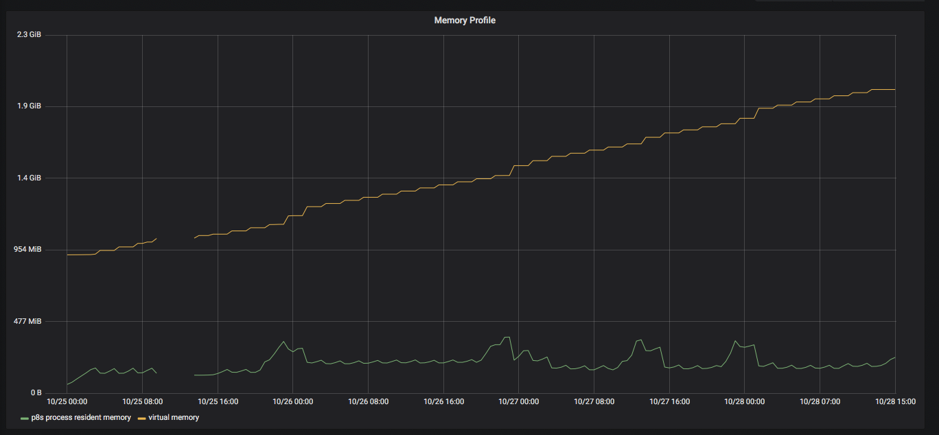 Provided screens are from standard Grafana dashboard offered to me upon Prometheus DS setup. I got this issue couple times but thats first time I caught it with Prometheus still working (it shuts down after a while but I have no idea why). From start Prometheus process uses up bit more memory every 2 hours (its shuttered due system shutdown - still virtual memory usage got back to same level):