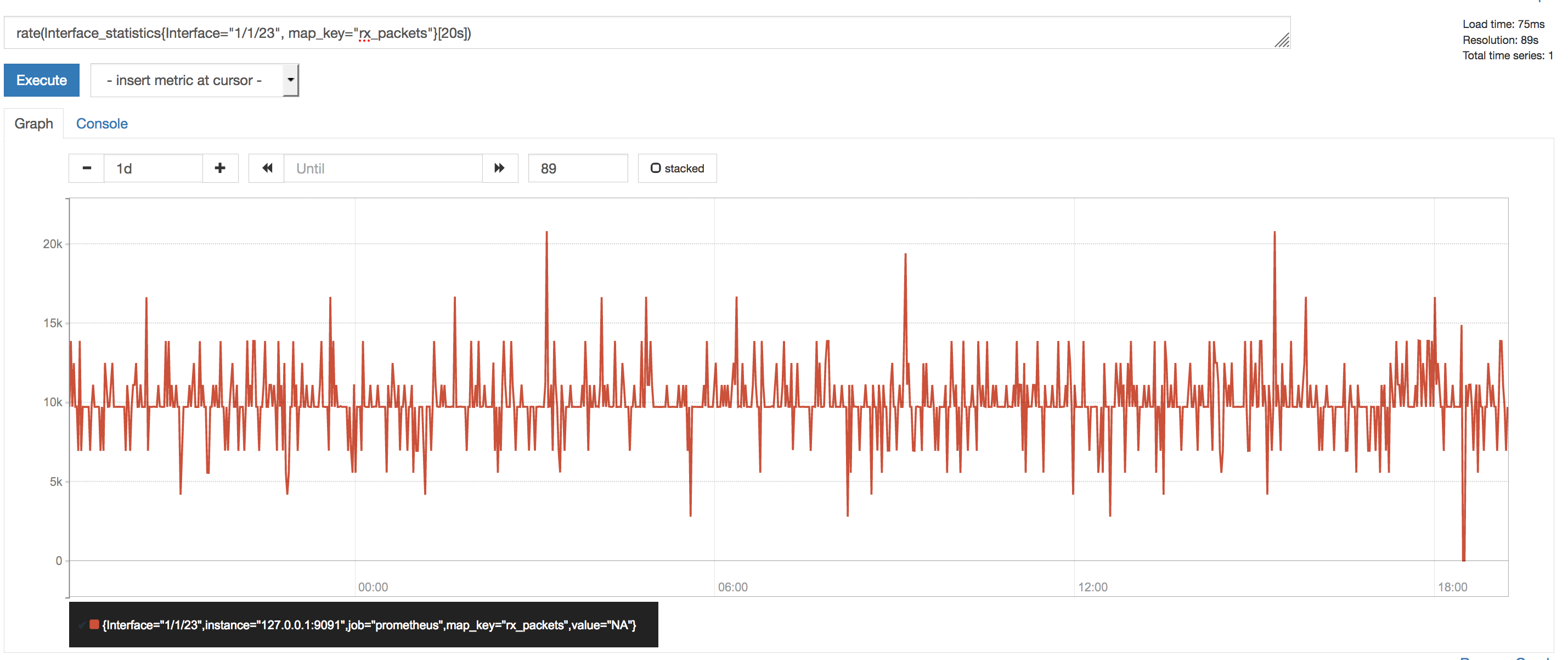 The metric in the recording rule is nearly constant around a particular value (around 15 k). Expected to see graph around a constant value in the same way as I see when I query the underlying expression(rate (Interface_statistics{map_key='rx_packets'}[20s])).