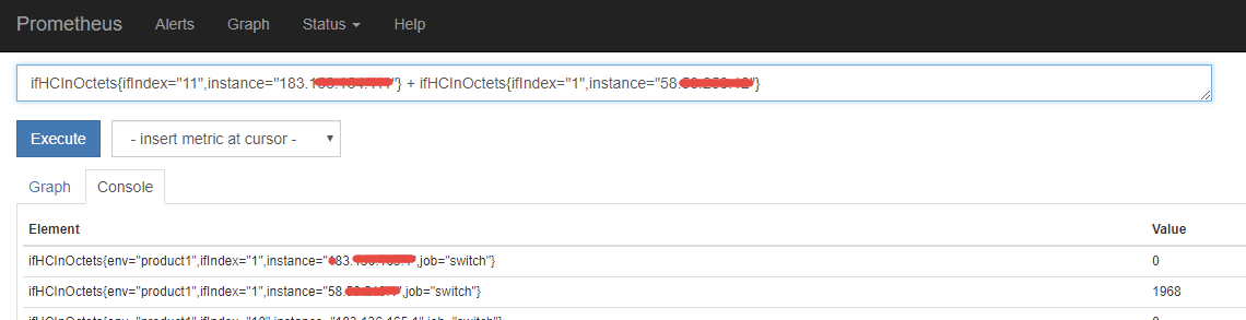 I want to sum the two values obtained from the same index based on different instance and ifindex. Does Prometheus not support cross-machine aggregation? like that: