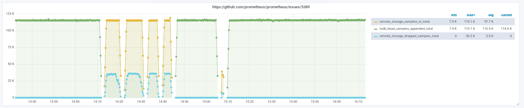 (1.7M timeseries in this instance tried on different prometheis instances, got the same results with different setup) Since it's dropped before actually pushing the metrics i don't think it's related to the software receiving remote_write stream. Here it's metrictank. |