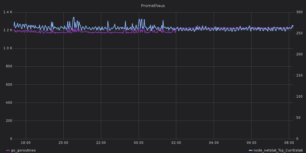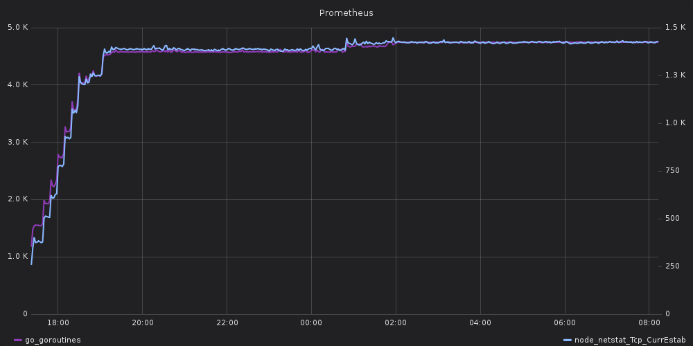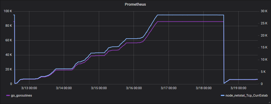 I noticed that my Prometheus server is leaking goroutines, and that it correlates to established TCP connections: