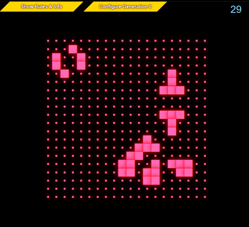 100% CSS + HTML implementation of Conway's Game of Life. 60 generations @ 20x20