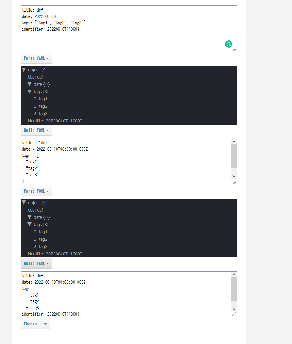 "date: " date "\n"Can you please share TOML front matter with one and then with two tags? Just to be sure I use the correct syntax. |