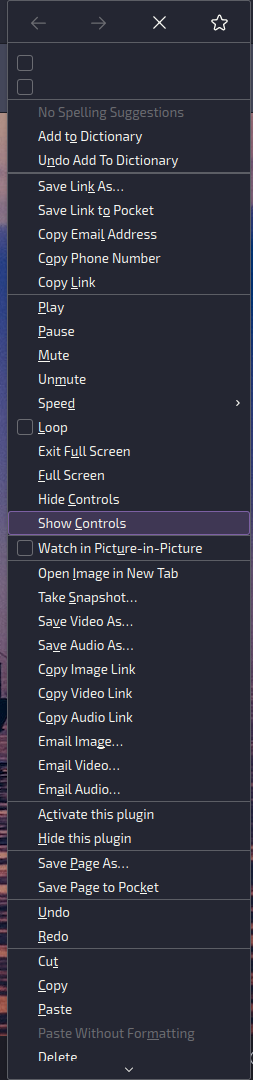 This was from right clicking empty space on the start page. As far as I can tell, there's no situation in which it'll ever show anything different. Options that don't make sense in the current context don't do anything when clicked, while ones that do ("copy" when having text selected for example) function as expected.